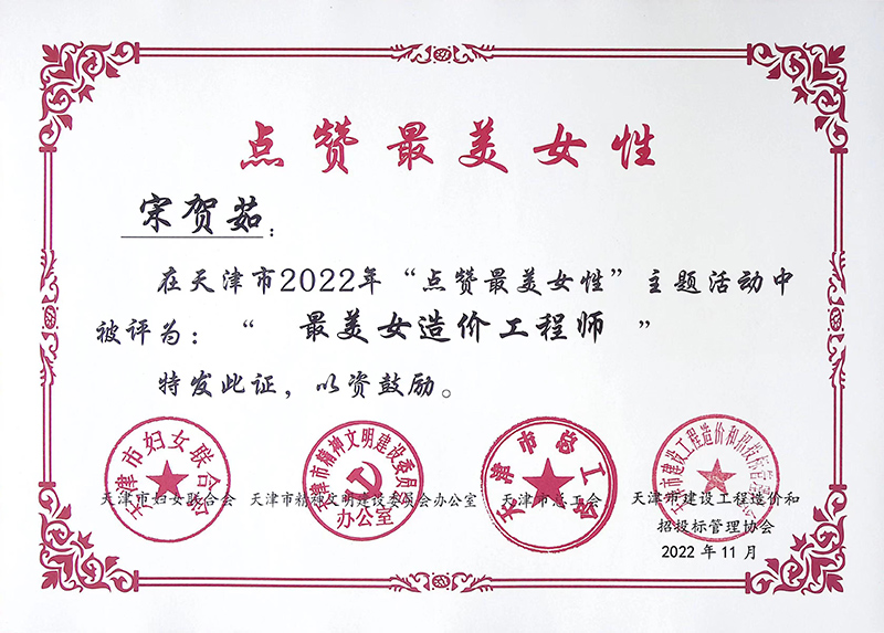 在“三八”國際勞動?jì)D女節(jié)到來之際,從天津市泛亞工程咨詢有限公司傳來喜訊:在市婦聯(lián)、市文明辦、市總工會、津價(jià)招協(xié)聯(lián)合開展的天津市2022年“點(diǎn)贊最美女性”主題活動中,泛亞公司造價(jià)三部部門經(jīng)理宋賀茹榮獲“最美女造價(jià)工程師”稱號。
