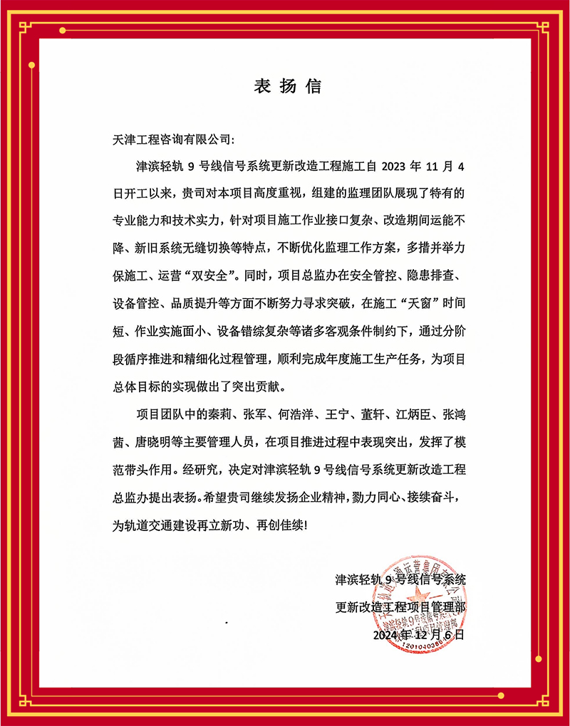 津濱輕軌9號線信號系統(tǒng)更新改造工程項目部感謝監(jiān)理團隊多舉措解決項目施工作業(yè)接口復(fù)雜、改造期間運能不降、新舊系統(tǒng)無縫切換等難題,力保施工、運營“雙安全”;天津長遠(yuǎn)嘉和置業(yè)有限公司贊賞含璋寶坻項目怡錦園項目監(jiān)理團隊以高度的責(zé)任心、高效的組織協(xié)調(diào)管理和扎實的專業(yè)技能推動項目圓滿完成;天津華勘穂金房地產(chǎn)開發(fā)有限公司感謝監(jiān)理項目部主動對接業(yè)主需求,有效管控質(zhì)量安全,切實保障施工進(jìn)度,很好地履行監(jiān)理職責(zé)......