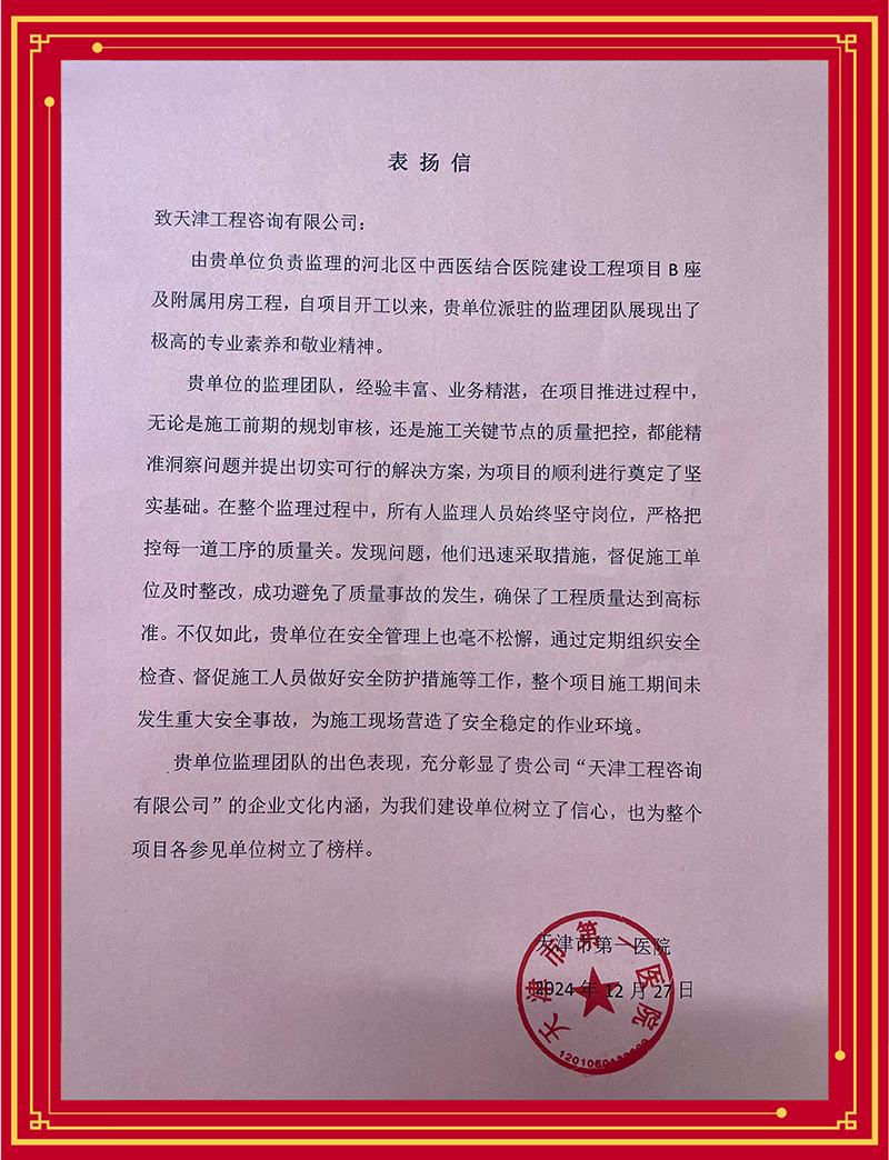 2024年,為持續(xù)深化“1264”戰(zhàn)略體系特別是“六化”舉措,加快推進(jìn)實體化進(jìn)程,天津咨詢順利完成吸收合并下屬成套監(jiān)理公司,在持續(xù)打造天津咨詢品牌,以工程監(jiān)理和項目管理為基礎(chǔ),發(fā)揮在項目建設(shè)期的綜合專業(yè)優(yōu)勢,逐步形成“監(jiān)”“管”一體化服務(wù)模式方面邁出關(guān)鍵一步。近期,多家業(yè)主單位先后發(fā)來感謝信、表揚信,對天津咨詢承擔(dān)工程建設(shè)監(jiān)理任務(wù)給予充分肯定。