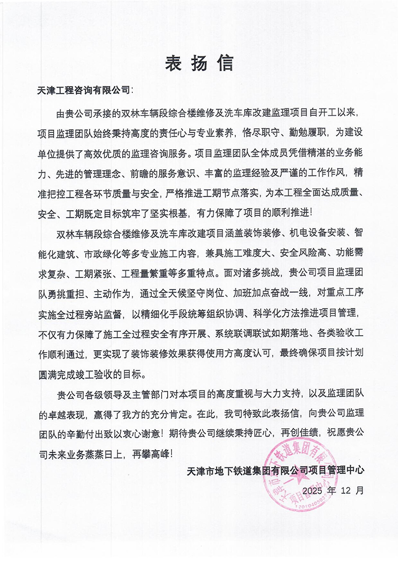 天津地鐵集團發來表揚信,對天津咨詢雙林車輛段綜合樓維修及洗車庫改建監理項目團隊精細統籌協調,高質量攻克多專業施工難題給予充分肯定,認為項目團隊保障了施工安全有序和裝修呈現理想效果,助力項目圓滿完成驗收。